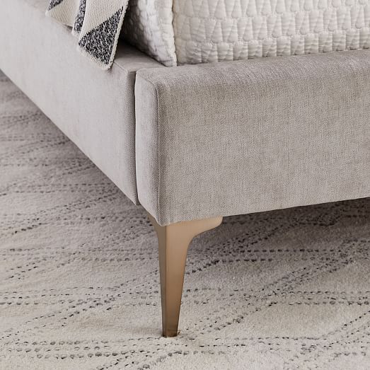 West Elm Andes Deco Upholstered Bed. It comes in your choice of upholstery fabric and leg finish so that you can pick the right one for you. Storage drawers open on both sides, revealing ample storage space for bedding or clothes.